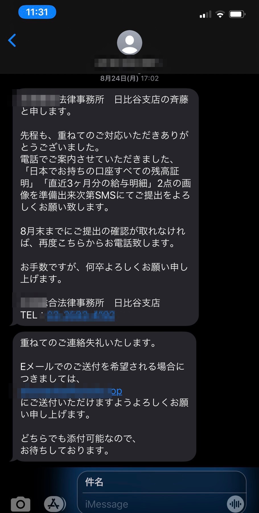 友人からの連絡で腰を抜かした。ある弁護士事務所からこんなSMSが届いたのだと言う。