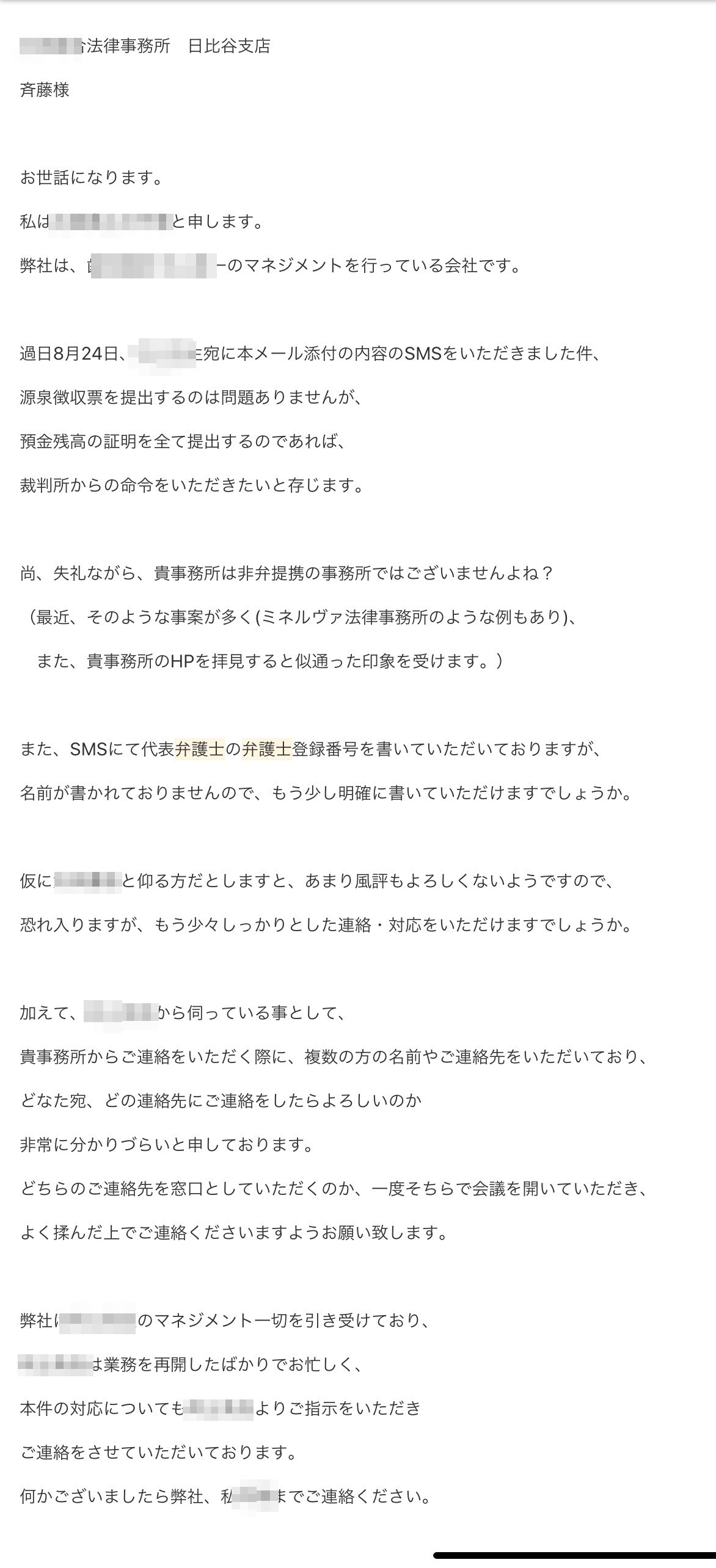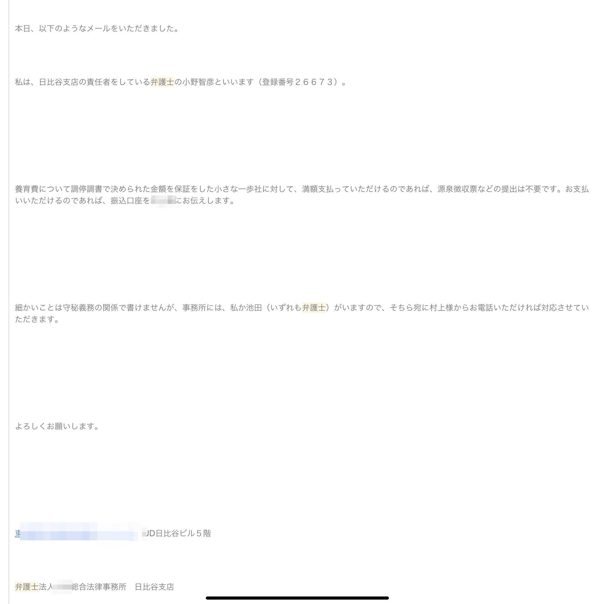 ワイ:弊社がマネジメントしている方が養育費のトラブルでお宅の弁護士事務所がワーワー言ってんだけどね?それが弁護士事務所だったり、何とかセンターだったり、メールくれと言うアドレスのドメインが違っていたり、オタクらナニ?振り込め詐欺じゃないよね?